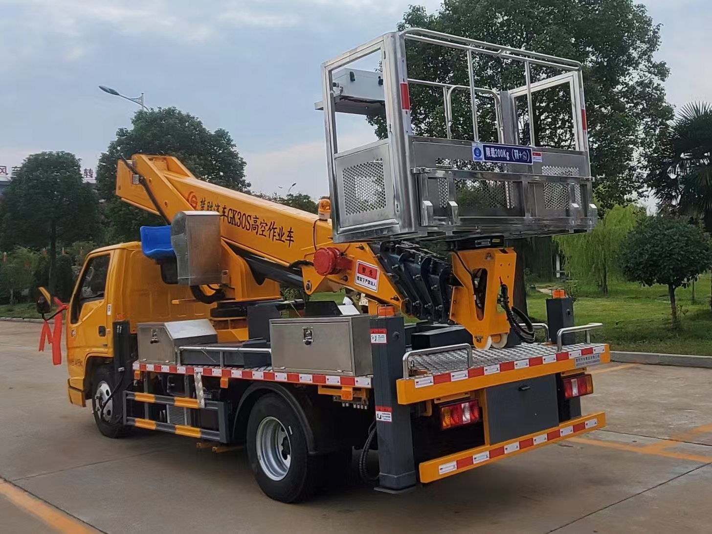 Operating height of 30 meters, telescopic arm, working bucket limit of 200kg, platform hydraulic 360 degree full rotation, working bucket 360 degree rotation, with automatic hydraulic leveling, hydraulic system with proportional control, turntable and working bucket dual position operation, all hydraulic systems are equipped with bidirectional hydraulic balance valves with locking function, electro-hydraulic proportional control, realizing infinite speed regulation of boarding action, equipped with emergency power source, effectively responding to emergencies, support legs are fully hydraulic, and have separate valve group control operation. Each leg is equipped with a strobe light, which automatically flashes in operation and is wireless remote controlled. The remote control is equipped with a horn button, which can provide remote warning reminders. The legs and boarding operations can be interlocked, making it safer and more reliable. Set up vehicle tilt alarm or soft leg alarm for safer use, limit function, dangerous condition alarm, configure tilt angle and length sensors to achieve amplitude control of high-altitude work vehicles. Vehicle turning limit. High altitude operations are equipped with speakers to provide safety warnings.